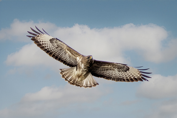 De buizerd is een middelgrote roofvogel met brede, ronde vleugels, bruine verenkleed en een karakteristiek zweefpatroon, veelal jagend op kleine zoogdieren en vogels.